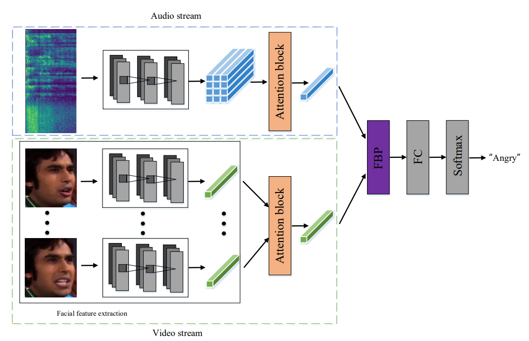 그렇게 각각 병렬적으로 audio, video로부터 emotion-relvant feature를 뽑아내고, 분리된 특별한 특징들(?) (논문에서 separate salient features라고 불리는데.. 특별한건진 그냥 각자의 특징인건지 자세하게는 모르겠다..)을 최종 예측을 위한 각각의 모달리티간의 관계성을 deep 하게 capture하기 위해 FBP block에서 합친다.