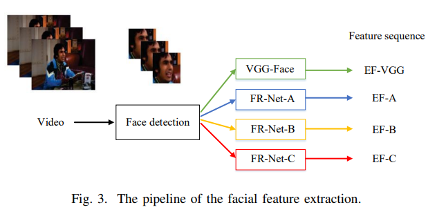 emotion recognition을 위해 4가지의 facial feature가 proposed 되고 이후의 진행은 audio stream과 거의 유사하게 진행된다.